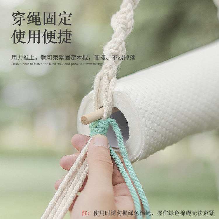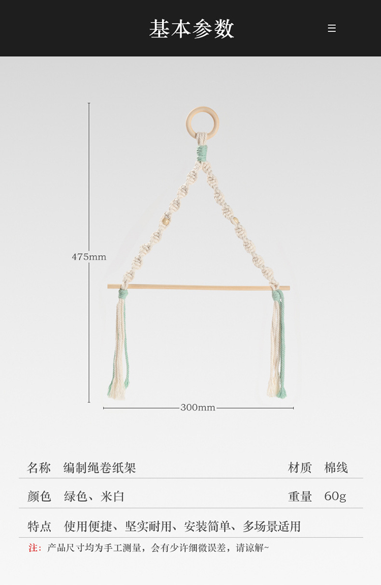 名稱:編製繩卷紙架 材質:棉線 顏色:綠色、米白 重量:60g 尺寸:475 X 300 mm 特點:使用方便、堅實耐用、安裝簡單、多埸合適用 注:產品尺寸均為手工測量,會有少許細微誤差,請諒解~