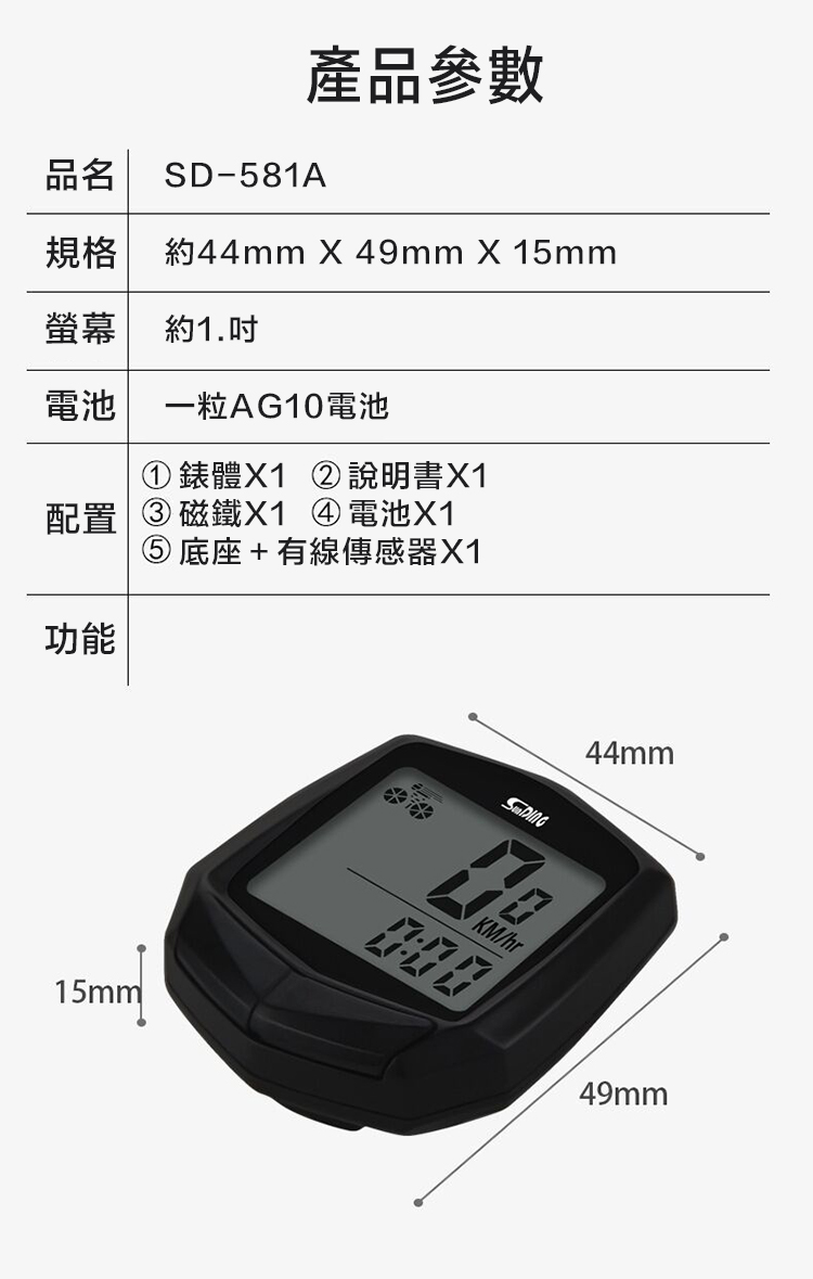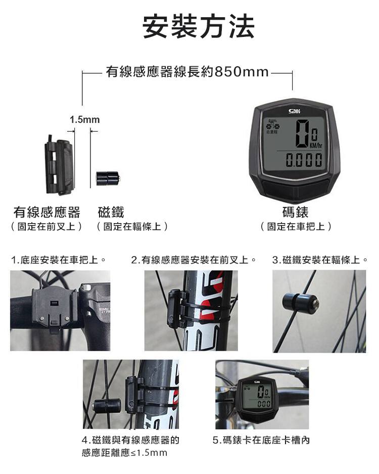 配置:1.錶體X1,2.說明書X1,3.磁鐵X1,4.電池X1,5.底座+有線傳感器X1