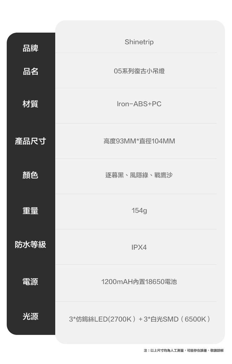 光源:3*仿鎢絲LED(2700K)+3*白光SMD(6500K)