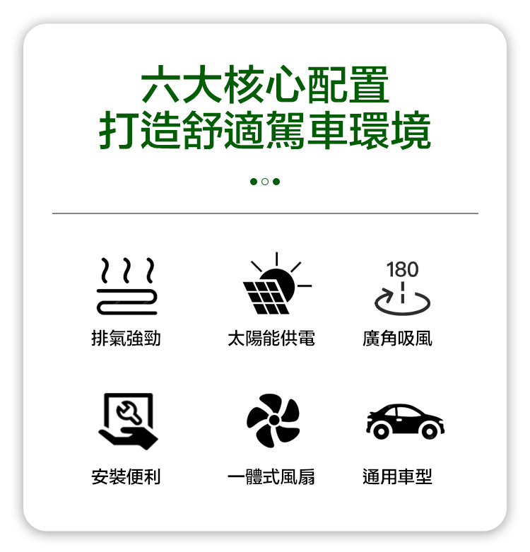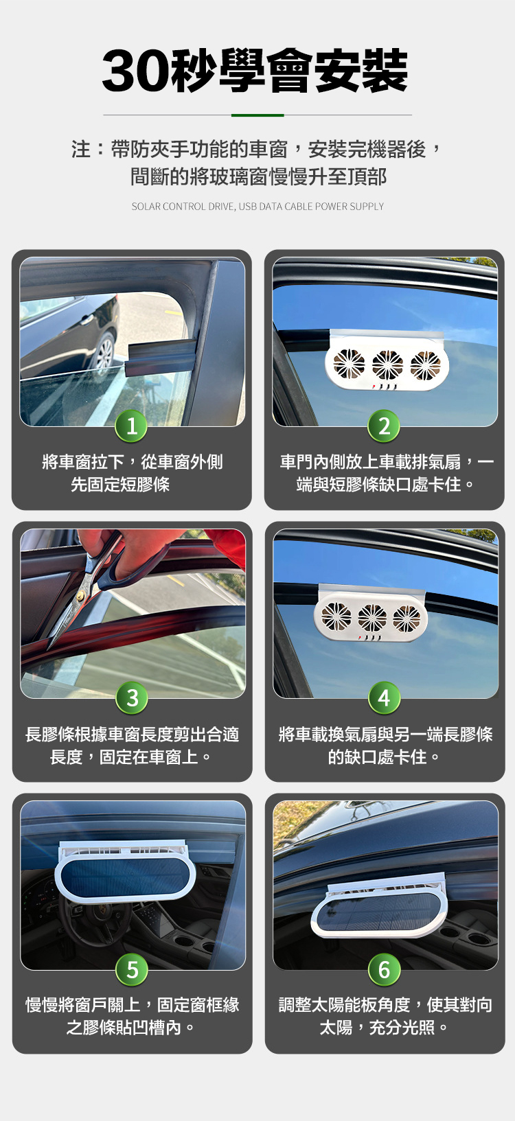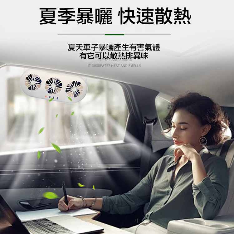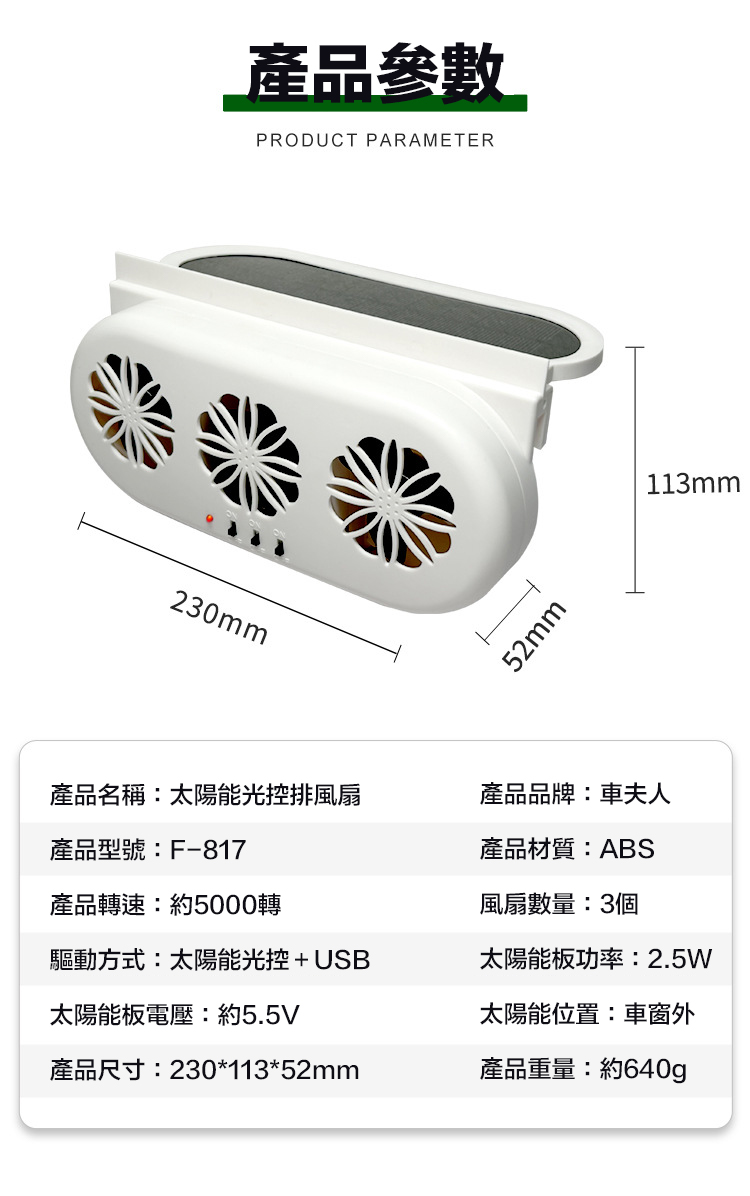 產品名稱:太陽能光控排風扇 產品型號:F-817 產品轉速:約5000轉 驅動方式:太陽能光控+USB 太陽能板電壓:約5.5V 產品尺寸:230*113*52mm 產品品牌:車夫人 產品材質:ABS 風扇數量:3個 太陽能板功率:2.5W 太陽能位置:車窗外 產品重量:約640g