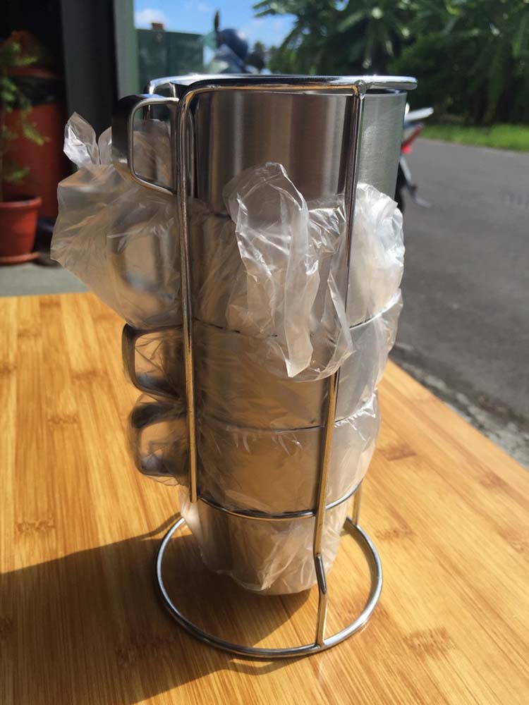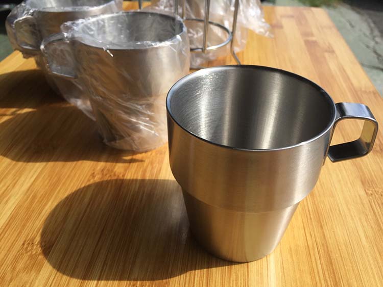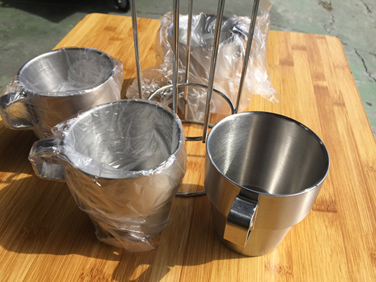 材質:SUS304不銹鋼內外杯身,不銹鋼把手,杯架鐵電鍍