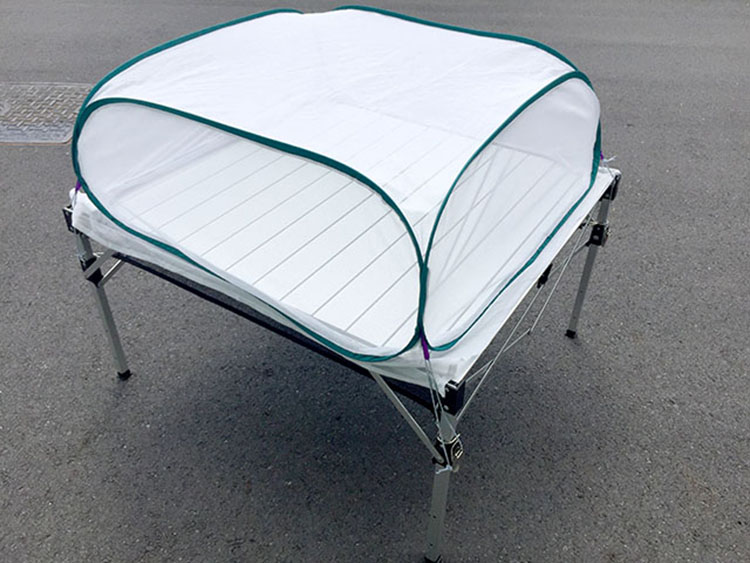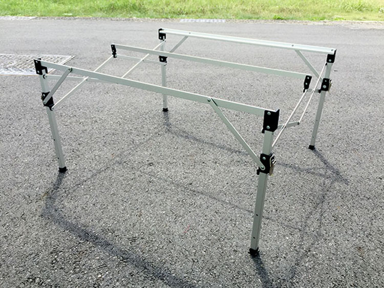 ◎打開腳架,扣上固定環,舖上鎂鋁桌版,7秒鐘就搞定。