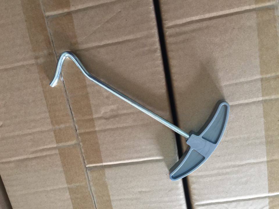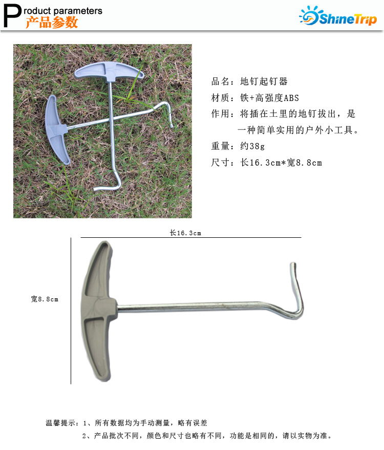 品名:拔釘器 材質:鐵+高強度ABS 作用:將插在土里的地釘拔出,是一種簡單實用的戶外小工具 重量:約38G 尺寸:長16.3*8.8CM