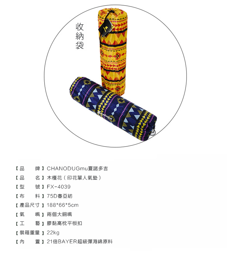 品牌:CHANODUGmu夏諾多吉 品名:木槿花(印花單人氣墊) 型號:FX-4039 布料:75D春亞紡 展開尺寸:188*66*5cm 氣嘴:兩個大銅嘴 工藝:膠黏高枕平板扣 內置:21倍BAYER超級彈海綿原料