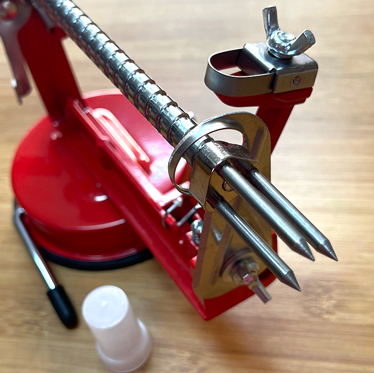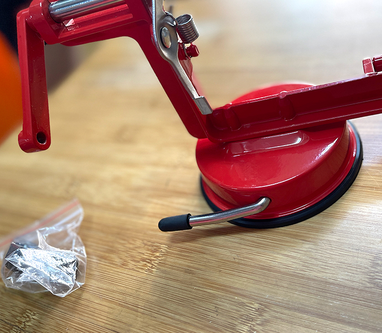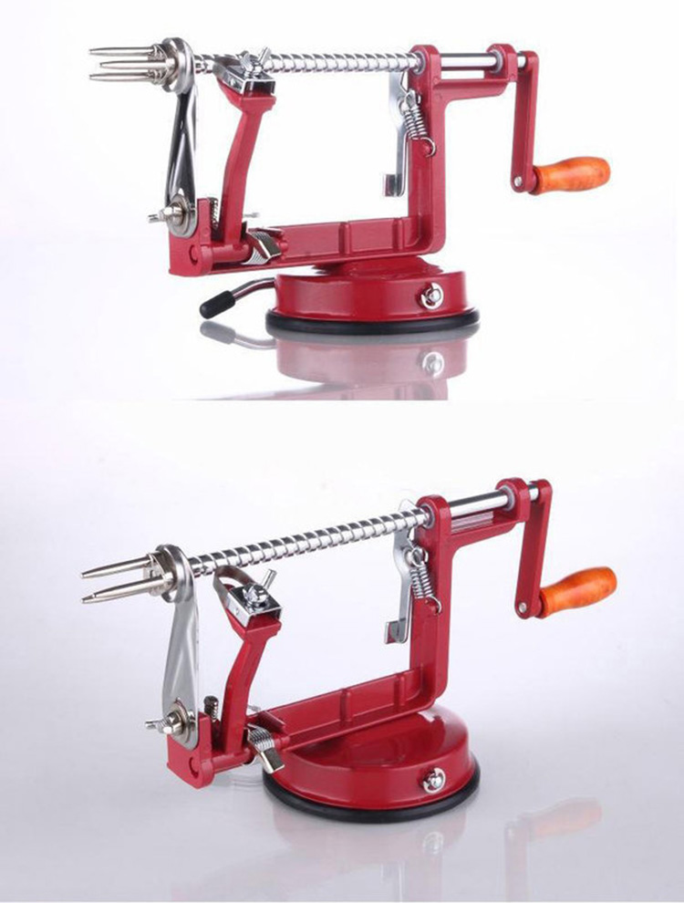 產品簡介: 本款式蘋果削皮機,採用鋁合金材料支架,配有真空原理的塑膠吸盤來固定機子,方便而牢固;而設計的彈性削皮刀具仿形能力很強,能適應切削果體的不同橢園度和凹凸面。通過手動操作,對果菜進行快速、同步削皮功能。相對於一般的塑料製品,具有堅固耐用,美觀大方、易於清洗、乾淨衛生等優點。廣泛適用於機關,企業,賓館,家庭,也可以作為最佳贈品,給老人送孝心,給孩子送關心,給朋友送愛心,給病人送一份溫馨,充分體現你的真心。 一.功能與原理:通過簡單操作,對蘋果果進行一次性地完成削皮、去芯和切薄片這三項功能,也可以只使用削皮功能。 二.特點:採用鋁合金支架,配有塑膠吸盤來固定機子;而設計的彈性削皮刀具仿形能力很強,能適應切削果體的不同橢園度和凹凸面。 使用方法: 1:使用前安裝手柄 2:利用機底吸盤固定機身 3把蘋果放置於機身插座 4:調整削皮刀削皮厚度後,轉動手柄開始削皮 5:削皮完成取下核後,將刀件退回原位 更具體的使用步驟可參照說明書,若有不明白的地方可以咨詢 ,我們會用心為您解答,直到您明白為止 機器本身全新醫用級刀片和食品級PP料,安全而成,是蘋果機中的明星產品。 相對於一般的塑料製品,具有堅固耐用,美觀大方、易於清洗、乾淨衛生等優點。另外該機功能頗多,削皮、切片、提核一次完成,也可以卸下前端的圓形刀片,只削皮,不切片,提核,是家居必備的最佳工具,對家中有老人、小孩的家庭來說非常適合。亦可用於飯店酒吧的拼盤製作,就在不經意間體現出您的精緻生活品質!