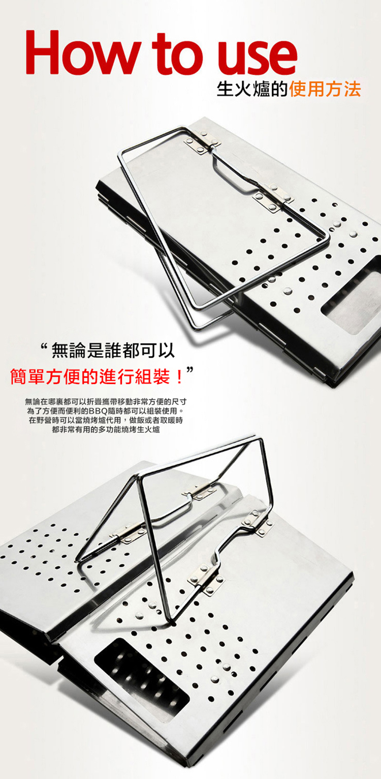 本款產品設計為可收縮的結構,輕鬆展開年可使用,收縮後體積小,攜帶方便,結構簡潔,易於清理,使用安全。儲存的時候,只需將燒烤爐收縮,放在家中的小角落即可,不佔空間;採用木炭為燃燒材料,適合戶外休閒燒烤,也適用於家中使用。