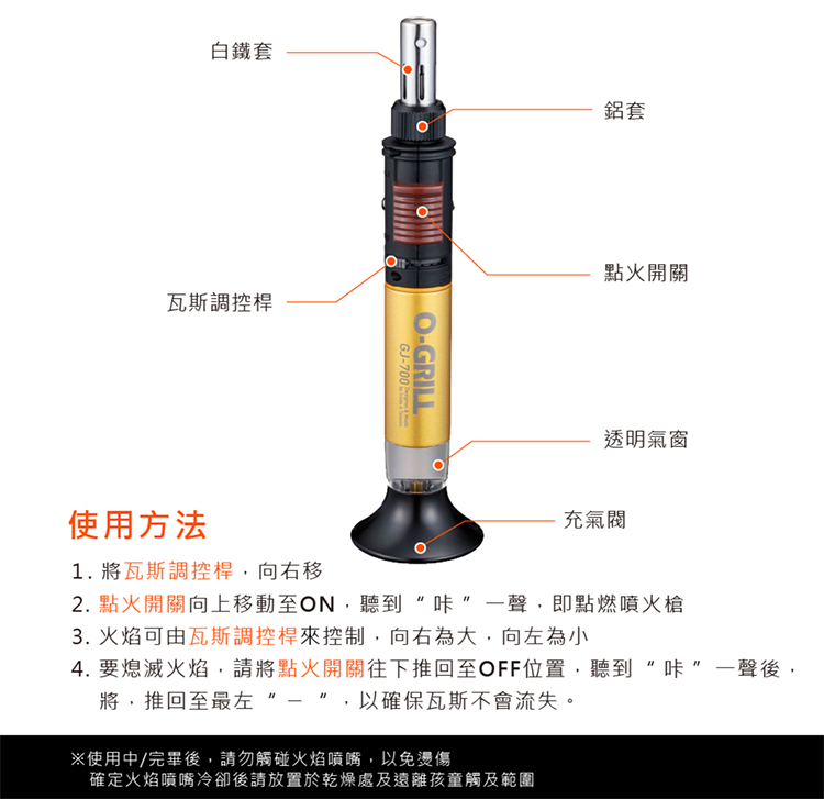 5.使用中/完畢後,請勿觸碰火焰噴嘴,避免高溫燙傷