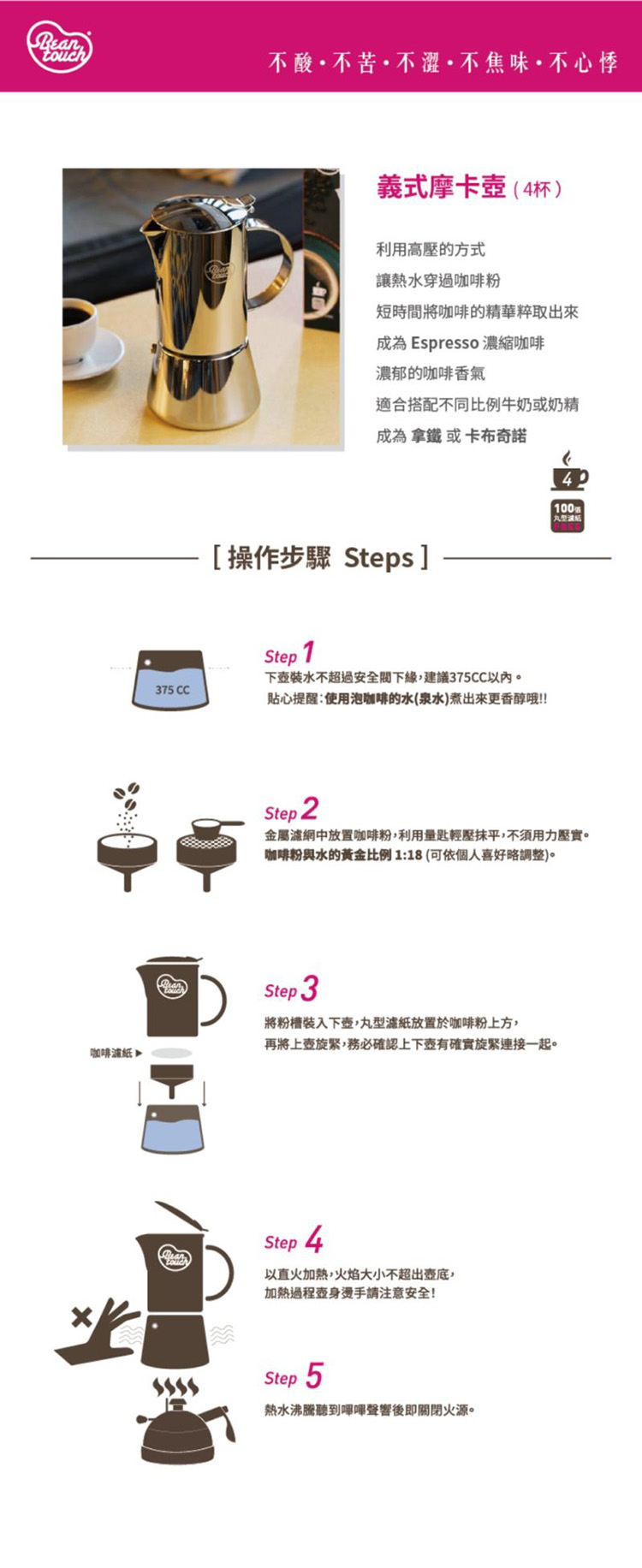 利用高壓的方式讓熱水穿過咖啡粉,短時間將咖啡的精華粹取出來,成為Espresso 濃縮咖啡