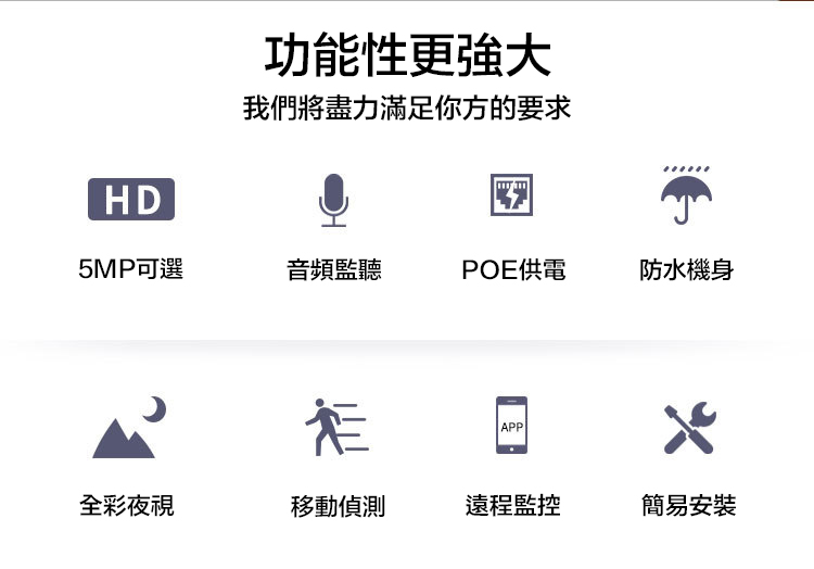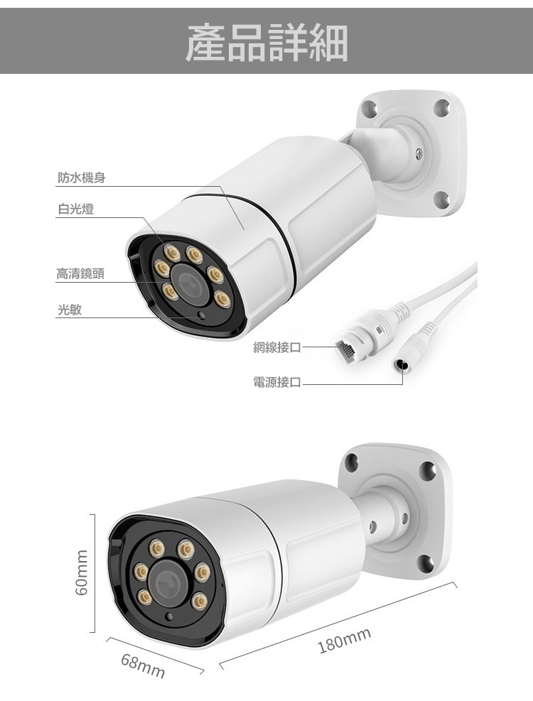 品名:POE供電攝像頭全彩夜視500萬高清攝像機 型號:EM-616K5F-E 像素:500萬(dpi) 類型:網絡攝像機 款式:槍式攝像機 圖像傳感器:CMOS 水平清晰度:5MP(TVL) 最低照度:0.001(Lux)