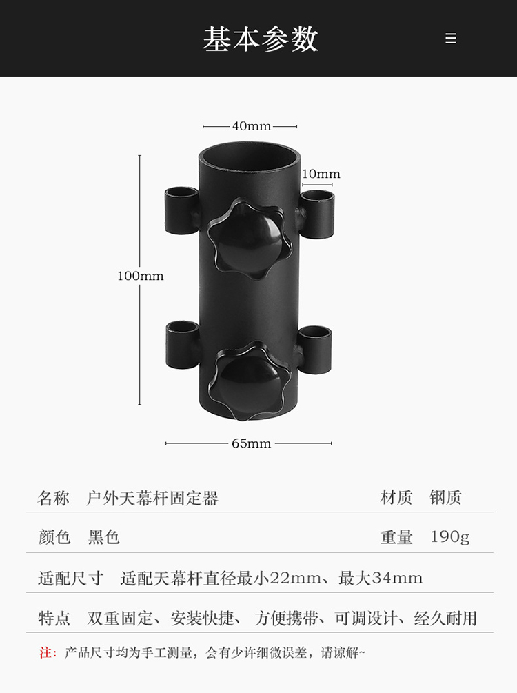 適配尺寸:適配天幕桿直徑最小22mm、最大34mm
