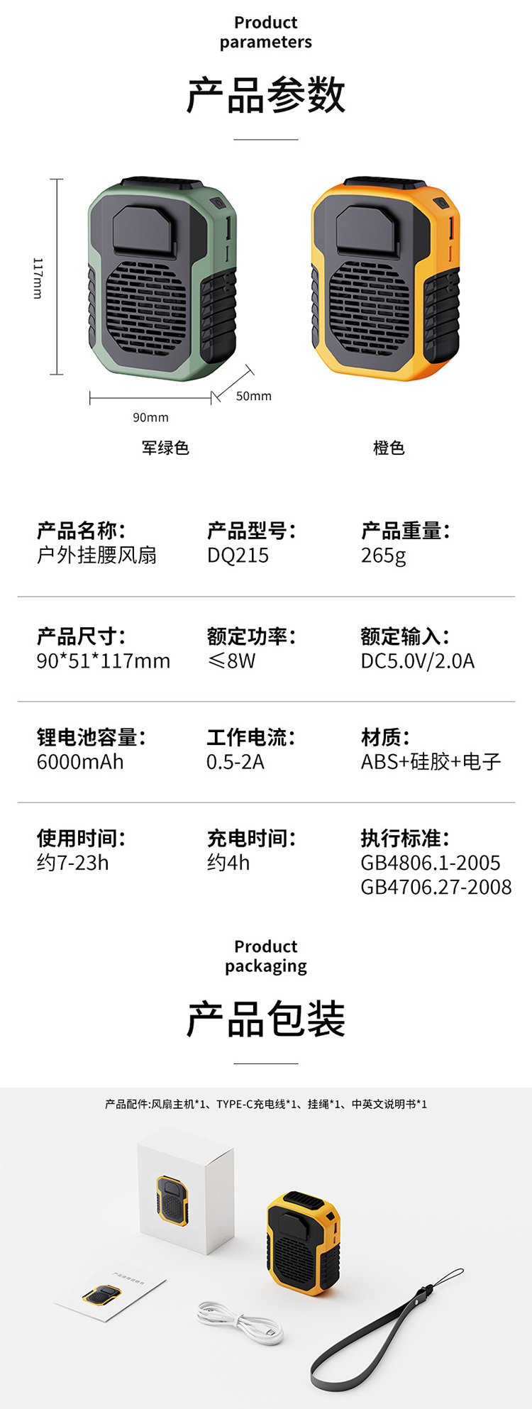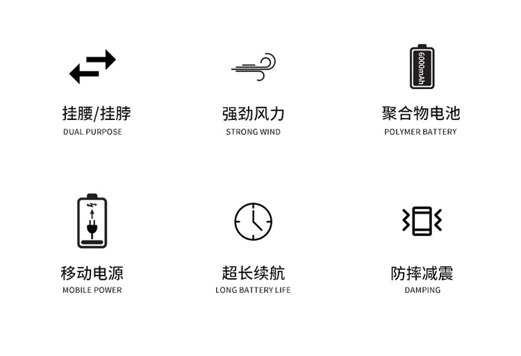 產品附帶配件明細:風扇主機*1、Type-c充電線*1、掛繩*1、中英文說明書*1 產品操作說明: